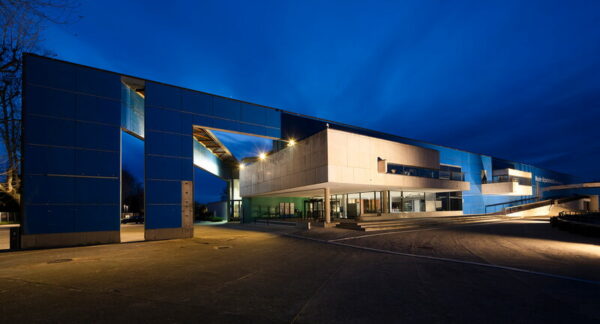 Ce bâtiment audacieux, conçu par l’architecte Henri Ciriani, offre un contraste saisissant : le bleu profond de ses murs de verre et de béton dialogue avec la blancheur lunaire du marbre de l’Hymette.